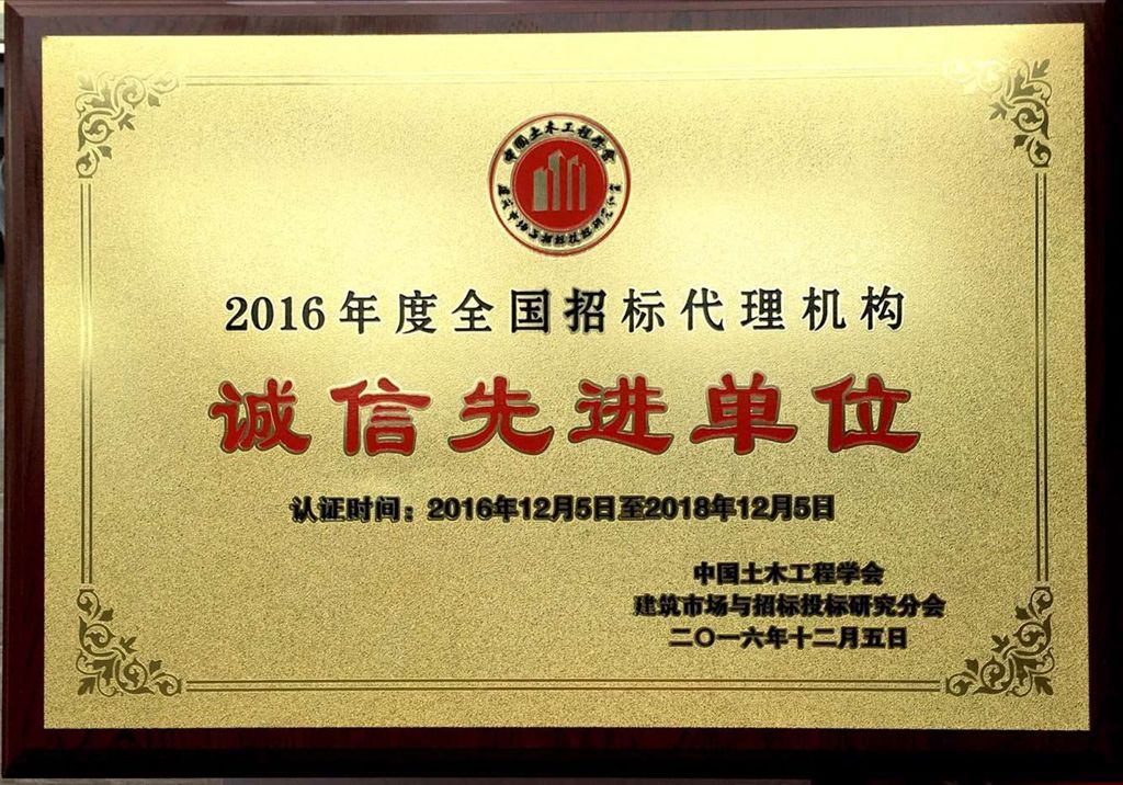 獲得2016年度全國招標代理機構誠信先進單位稱號